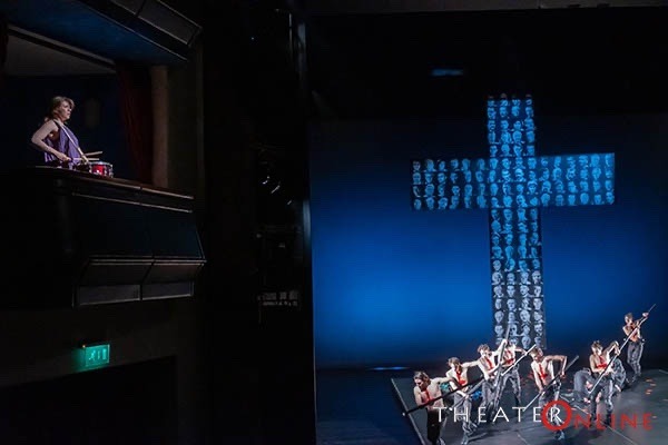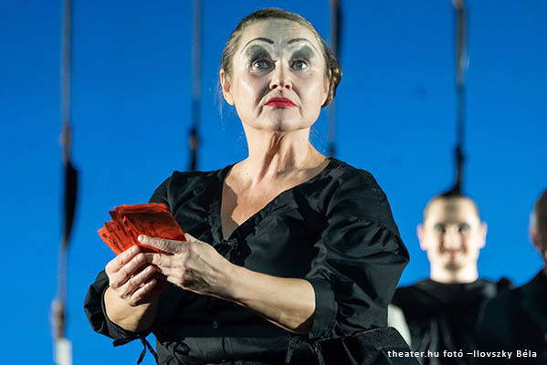 A játék sokszor némán balett- és pantomim-szerű, vonagló, kúszó, masírozó haláltánc, amit a közönség lélegzetvisszafojtva követ. A történetmesélés töredezett, mégis mindenki érti, zsigerrel átélhető a látvány-élmény. Dramaturg: Kozma András és Szabó Réka. Nekik is köszönhető, hogy óraműszerűen, de a színház iránti alázattal össze tud állni a Nemzeti színészeiből és főiskolásokból működő gépezet. A hagyományos szerepektől eltérő alakítások közül kiemelem a Halál/mesélő Bordás Rolandot, aki sátáni karmester. Démoni a titokzatos Szakács, a rémisztő Pap, akik üzlettársak is. Nehéz kettősségeiket remekül formálja meg Varga József és Schnell Ádám. Jól illeszkednek a misztériumba az Yvette és Kattrin figuráit formáló Polyák Anita és Kiss Anna Gizella egyetemi hallgatók. A női sorsokat áldozatokként megjelenítő Parasztasszonyokként dicsérem Szilágyi Ágotát és Nagy Marit, valamint a menthetetlen Eilif fiút előadó Hercegh Pétert. A lényeg, az egész társaság: együtt-élő kísértetvilág.