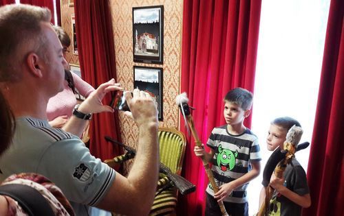 Kis Balázs, a színház műszaki vezetője a színpad titkaival ismertette meg a látogatókat, majd következett a fodrásztár, ahol akár bajuszt és szakállt is választhattak maguknak a résztvevők.