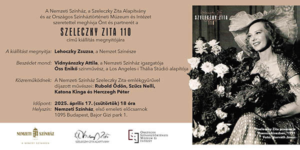 A Nemzeti Színház Szeleczky Zita születésének évfordulója alkalmából Szeleczky Zita 110 című kiállítással emlékezik a legendás színésznőre. A megnyitón Vidnyánszky Attila, a Nemzeti Színház igazgatója és Óss Enikő színművész, a Los Angeles-i Thália Stúdió alapítója szól a vendégekhez. Közreműködnek: A Nemzeti Színház Szeleczky Zita-emlékgyűrűvel díjazott művészei: Rubold Ödön, Szűcs Nelli, Katona Kinga és Herczegh Péter