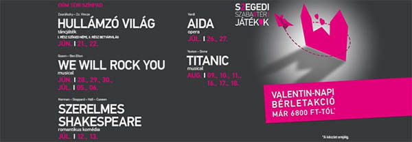 A nyár legromantikusabb musicaljét ajándékba is adhatod annak, aki Neked a legkedvesebb: egy Valentin-napi bérletben akár három szerelmes történet is elfér, az Aida, a Szerelmes Shakespeare és a Titanic musical! Február 1-től már kaphatók a Szabadtéri Valentin-napi bérletei a fesztivál jegyirodájában, valamint online is. Valentin-napra pedig meglepetéssel is készülünk a REÖK előtt azoknak, akik különleges módon vallanának szerelmet – idén is vállalja a Szabadtéri a szívből jövő üzenetek postásának megtisztelő szerepét